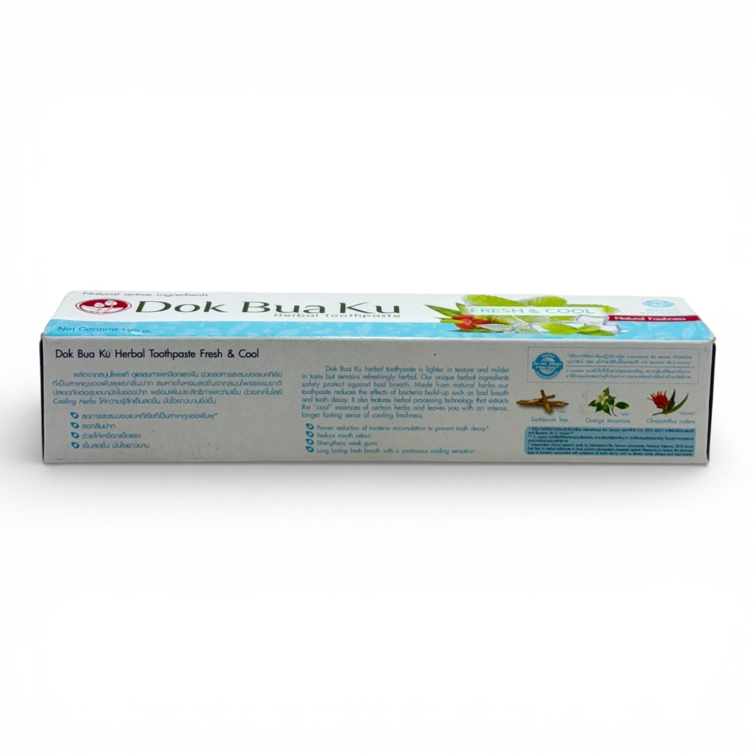 Dok Bua Ku Sensitive Herbal Toothpaste Fresh and Cool is specially formulated for sensitive teeth and gums. Enriched with herbal extracts, it gently cleans teeth while helping to reduce sensitivity and protect gum health. The refreshing fresh and cool formula provides long-lasting freshness, leaving your mouth clean, comfortable, and revitalized after every use. Ideal for daily oral care without harsh abrasives.