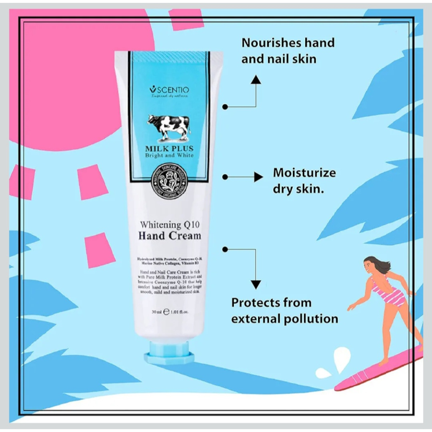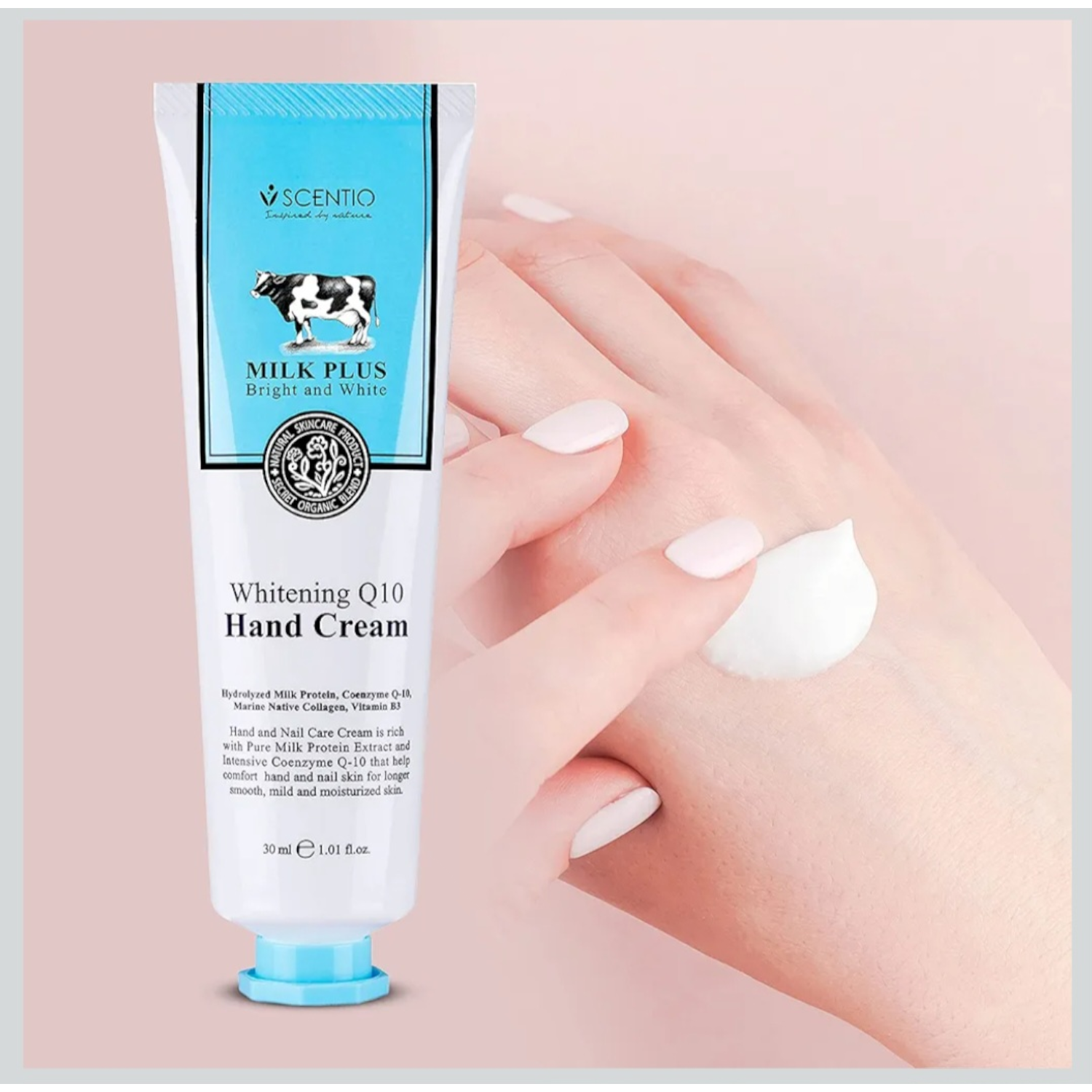 Scentio Milk Plus Organic Whitening Q10 Hand Cream is a nourishing hand care formula enriched with Milk Extract and Coenzyme Q10. It helps moisturize dry hands while supporting a brighter and smoother-looking appearance. The lightweight, non-greasy texture absorbs quickly, leaving hands soft, supple, and refreshed without sticky residue.