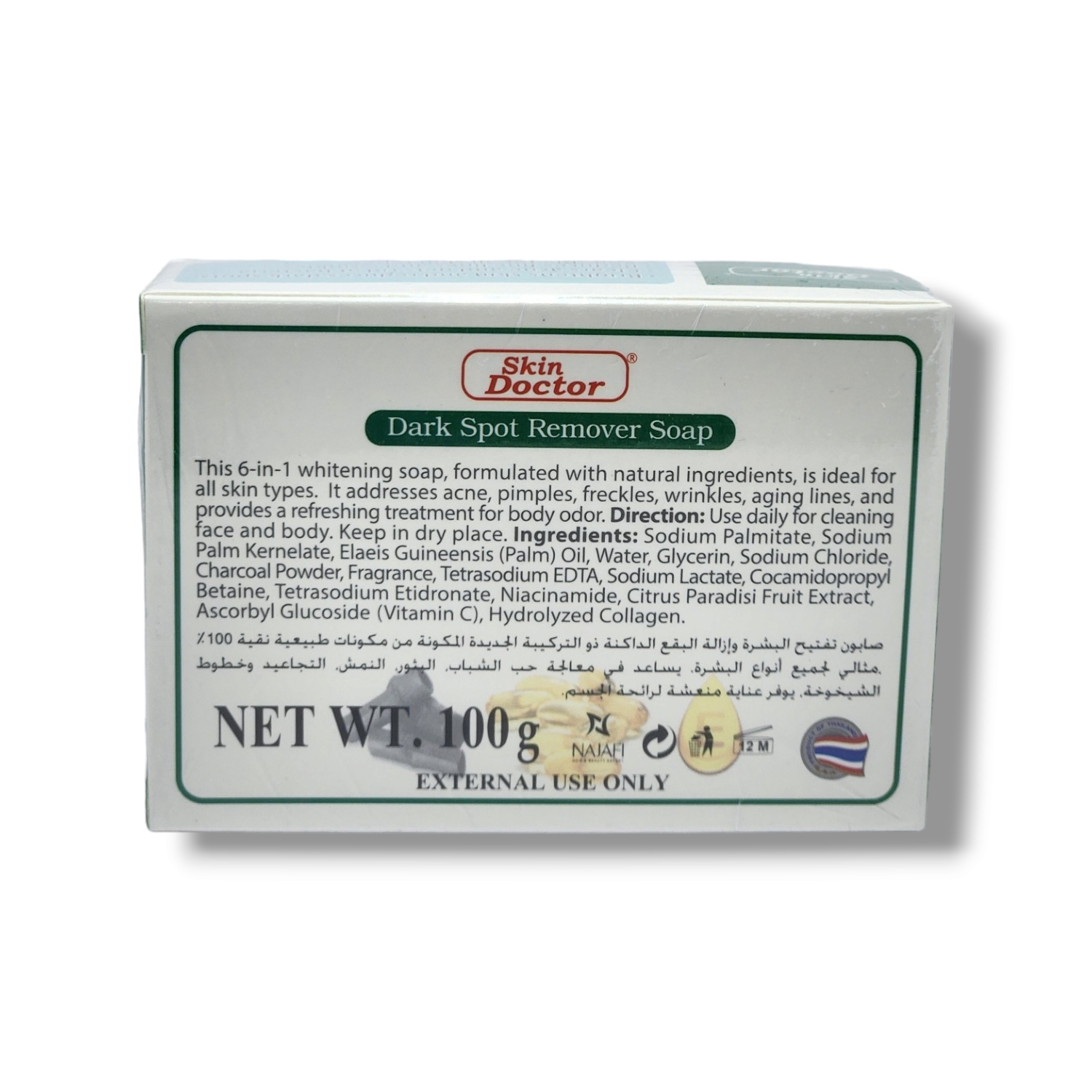 Skin Doctor Dark Spot Remover Soap is specially formulated to target stubborn dark spots and uneven pigmentation. This powerful brightening soap gently exfoliates the skin to remove blemishes and discoloration. With regular use, it promotes a clearer, smoother, and more radiant complexion. Its nourishing ingredients help improve skin texture and maintain a healthy glow.