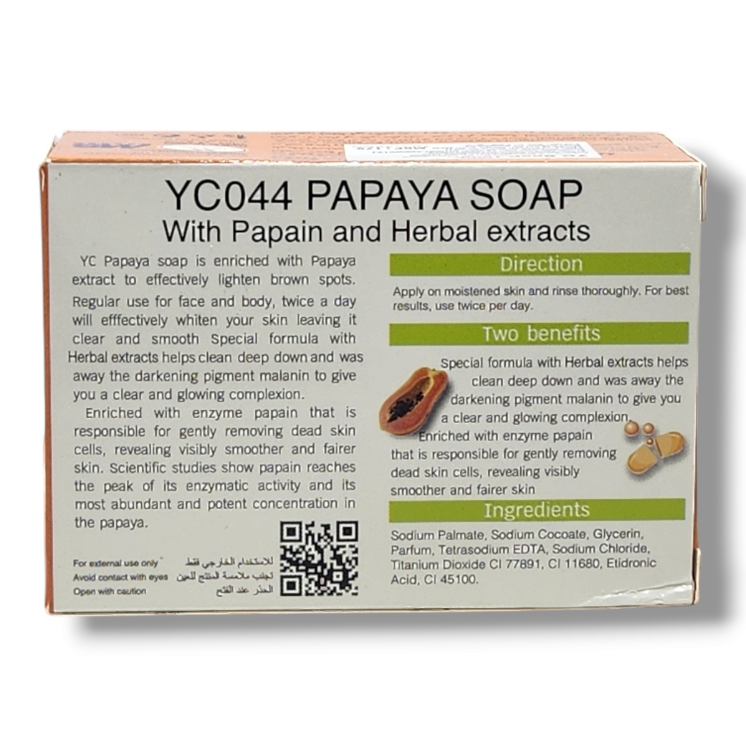 YC Papaya Brightening Soap is enriched with natural papaya extract to gently exfoliate and brighten the skin. Its advanced formula helps lighten dark spots, fade blemishes, and promote a clearer complexion. With consistent use, it reveals smoother, softer, and naturally radiant skin. Ideal for daily cleansing on both face and body.